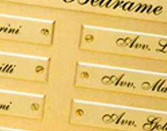 Realizziamo targhette in ottone con incisione a pantografo o con stampa a colori. Le targhette in ottone vengono spesso utilizzate per rappresentazioni di attività o nomi su porte all'interno o sugli ingressi pedonali all'esterno, hanno una resistenza meccanica molto alta e offrono alta resistenza agli agenti atmosferici.